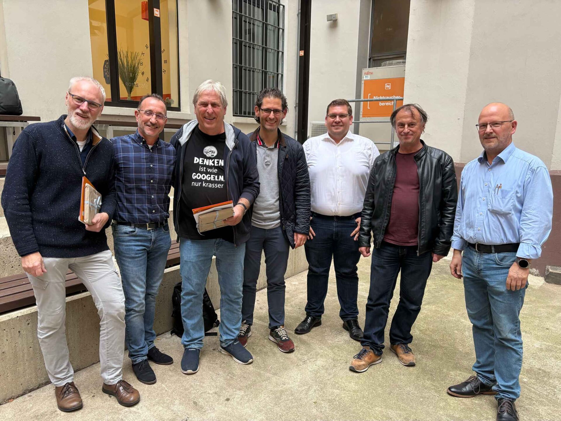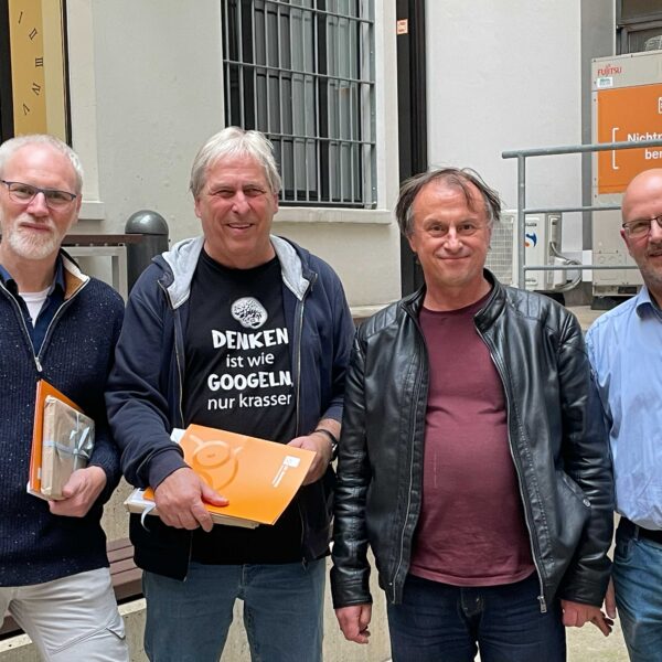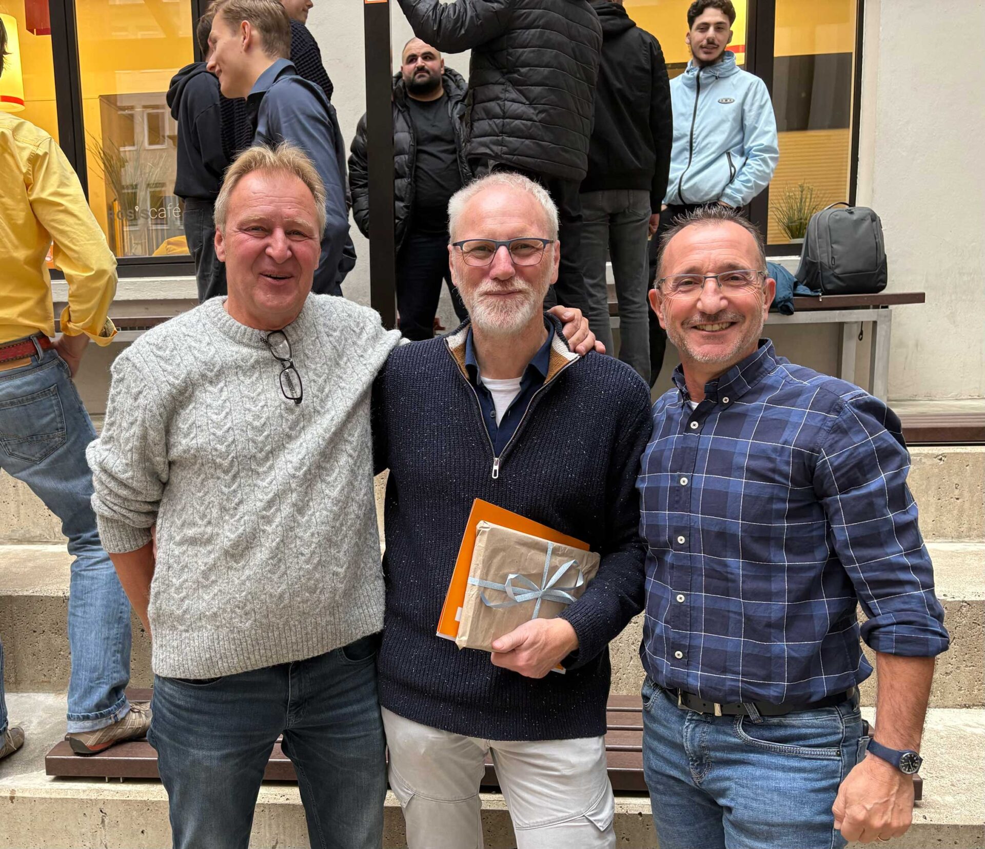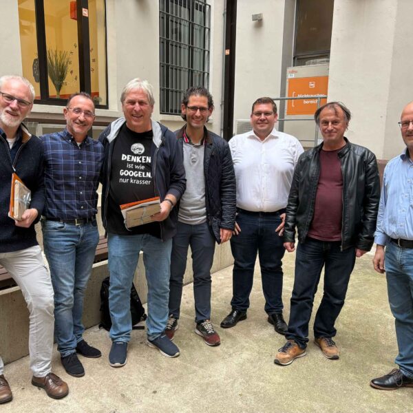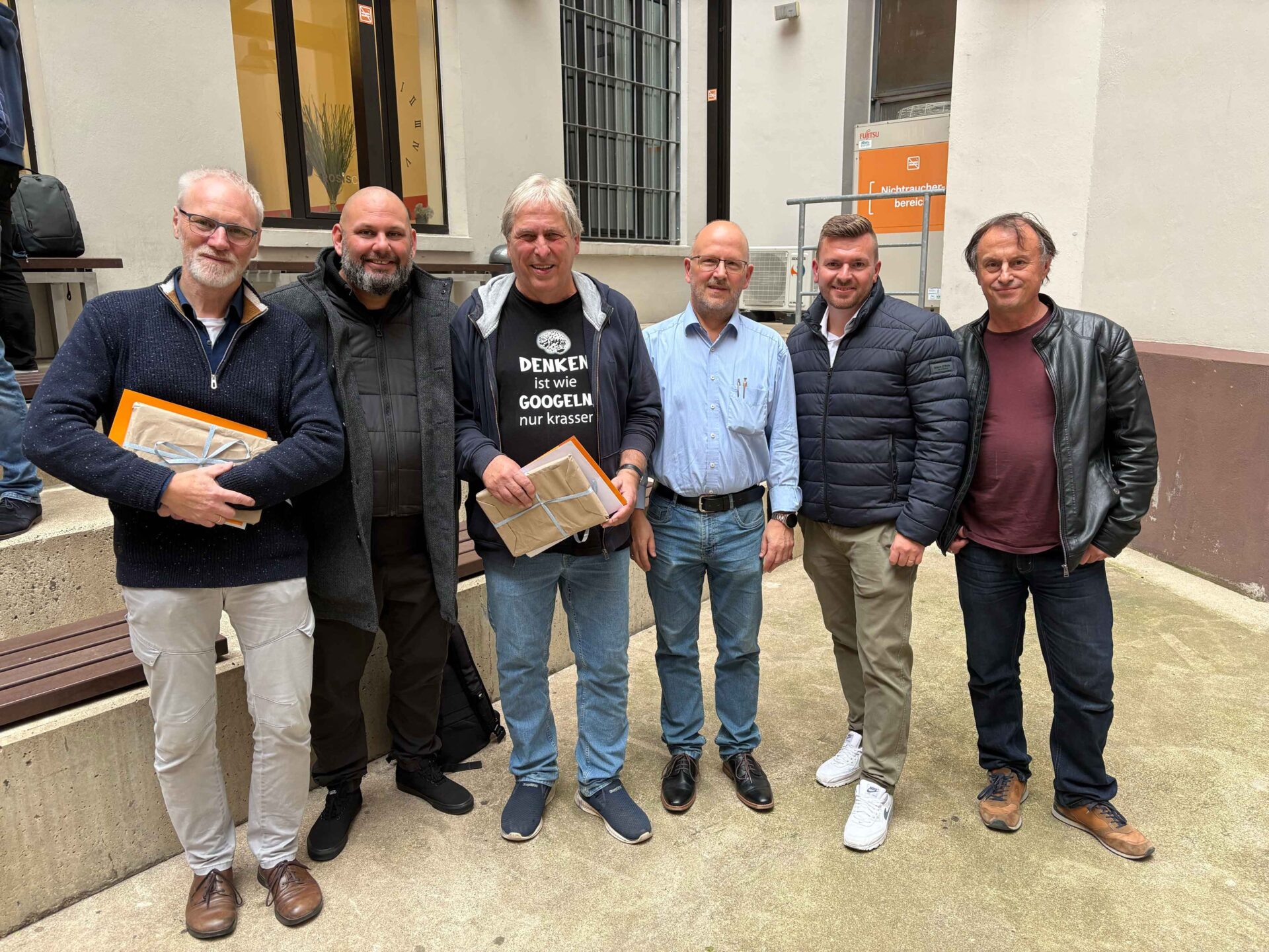 Nach einer Würdigung ihrer Leistungen beim Aufbau und der Entwicklung der Ausbildungen über diese lange Zeit erhielten die beiden ihre „Abschlusszeugnisse“ mit der Versetzung in den Ruhestand. Besondere Anerkennungen wurden dabei ausgesprochen für Herrn Bodenstein für seine kreativen und nerdigen T-Shirts und für Herrn Rolke-Römermann für die Anwendung der Programmiersprache „Grüner Tee“. Außerdem erhielten sie noch Stundenpläne, um ihnen die Umstellung auf das beschauliche Rentner-Dasein zu erleichtern. Wichtiger Tagesordnungspunkt: Hilfemails von ehemaligen Kolleg:innen ignorieren!